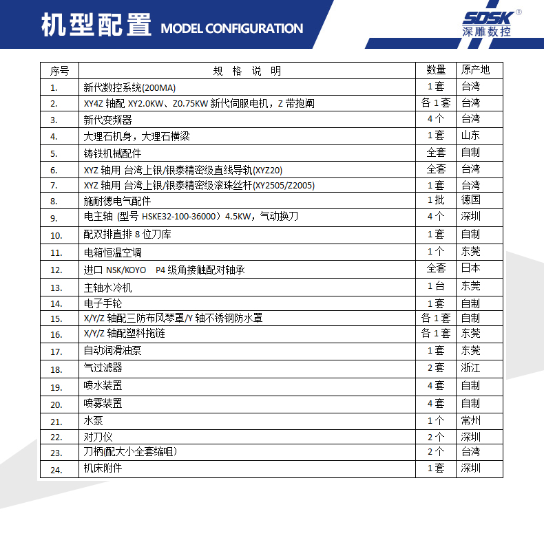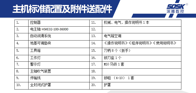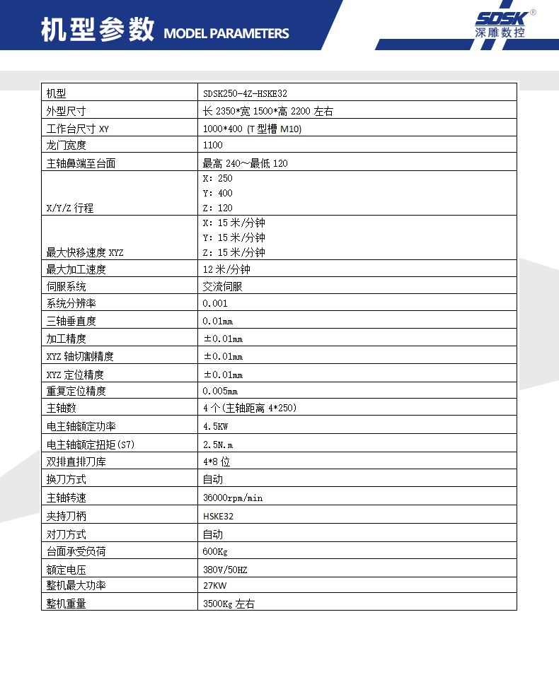1、SDSK250-4Z-HSKE32機(jī)型是專門為客戶量身定做的四頭精雕機(jī); 配雙排直排8位刀庫;運(yùn)動方式為Y軸工作臺前后移動,X軸左右移動,Z軸上下移動。